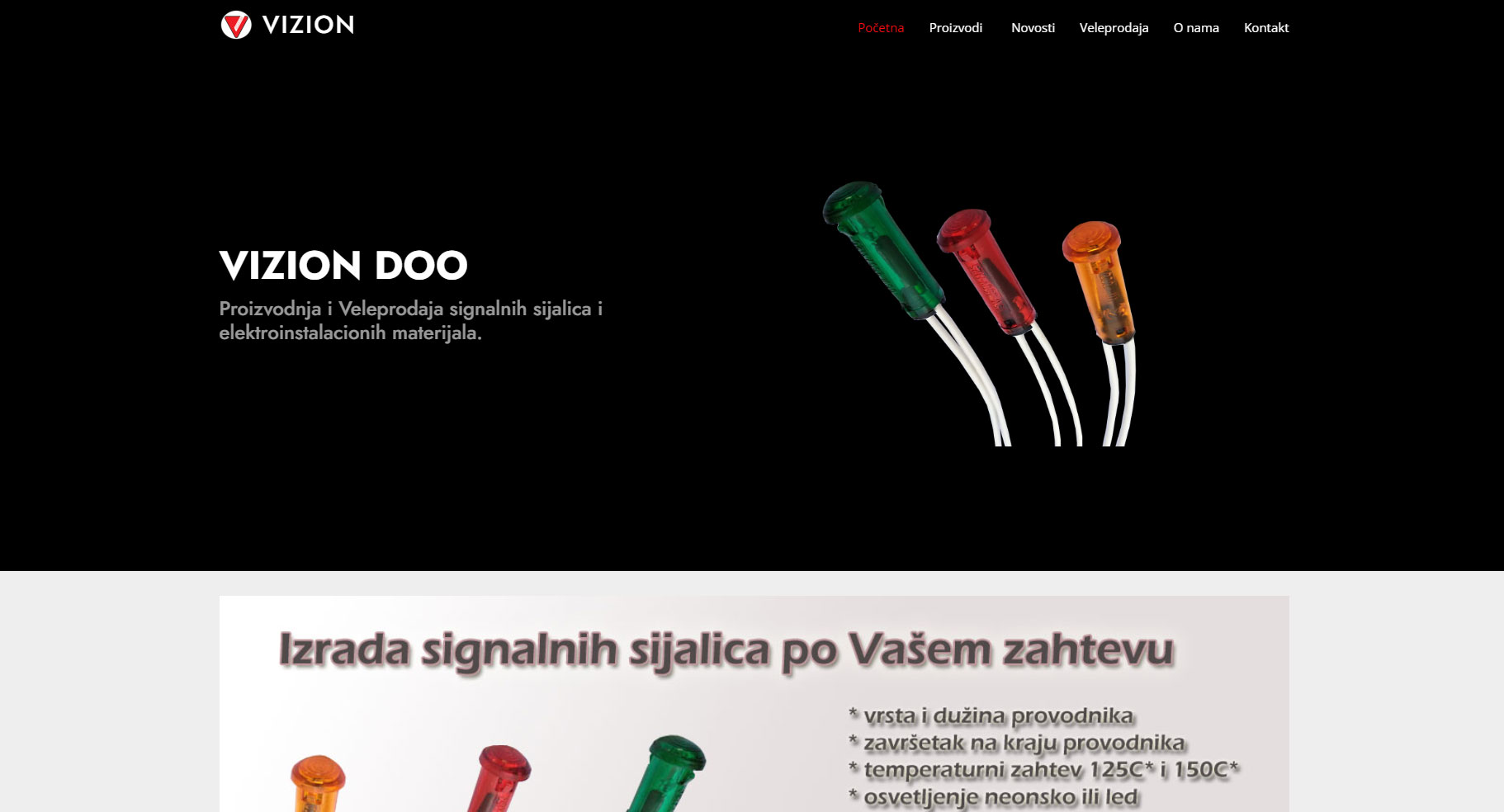 Vizion.rs Vizion d.o.o. je preduzeće koje se bavi proizvodnjom i velikoprodajom signalnih sijalica i elektroinstalacionih materijala. Trgovina obuhvata velikoprodaju i maloprodaju, sve za kućnu instalaciju "od dozne do brojila". Imamo širok asortiman robe, povoljne cene kao i uslove plaćanja.