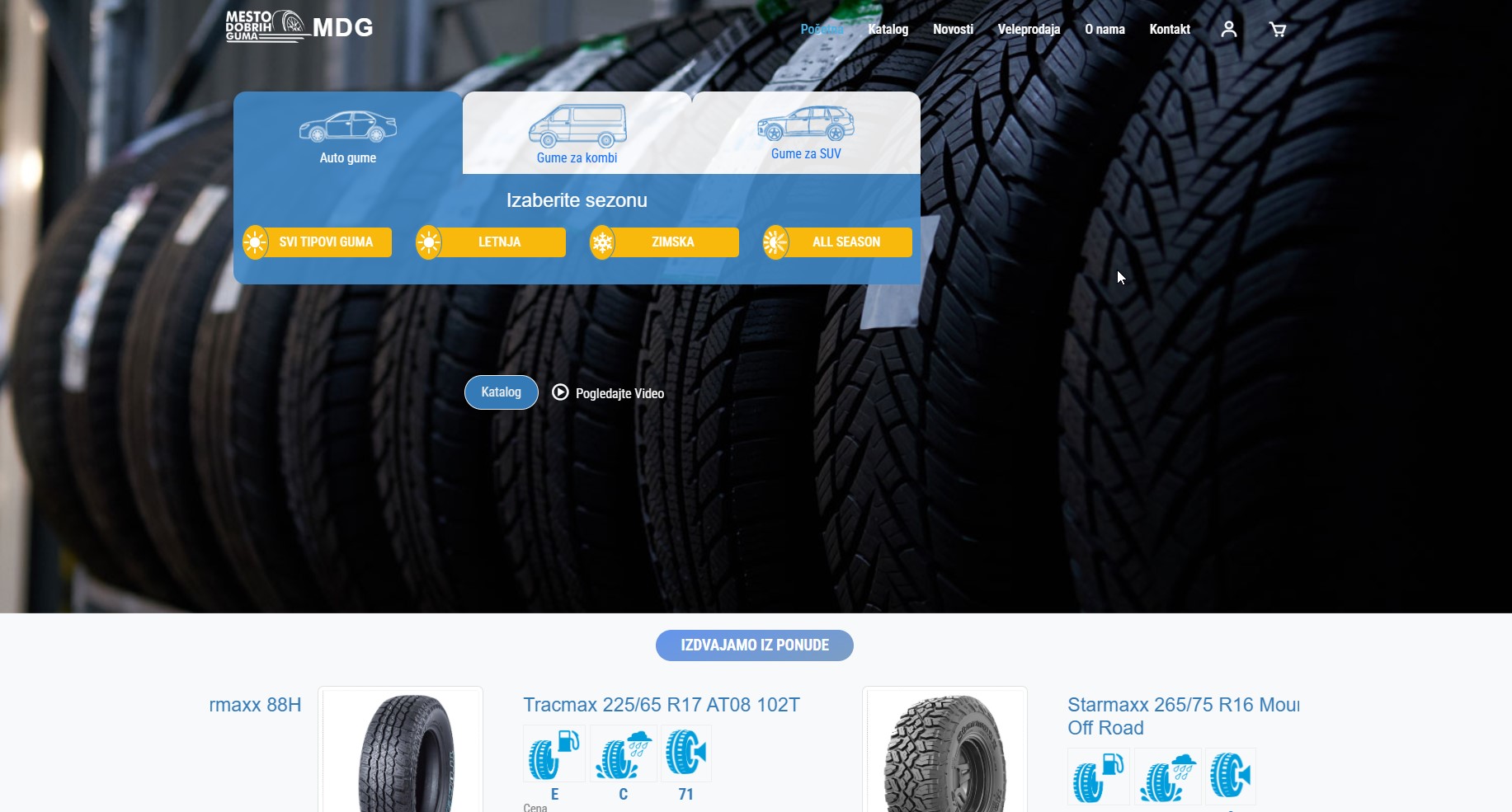 mdg.rs Pronađite i kupite brzo i sigurno gume za vaš auto, kombi ili SUV. Letnje gume, zimske gume i gume za sve sezone. Pronađite odgovarajuće gume po proizvođaču i modelu vozila, dimenzijama ili sezoni. Kvalitet, sigurnost i pouzdano partnerstvo na svakom kilometru i svakom terenu.